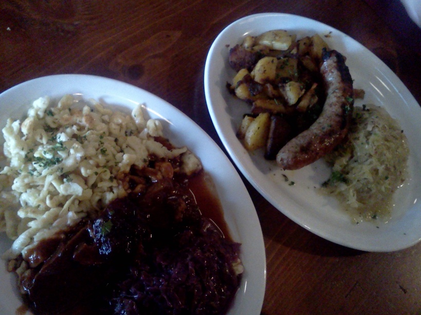 僕が頼んだのは手前の黒っぽいやつでSauerbraten with Spätzle and Red Cabage
