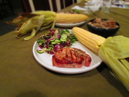 とうもろこしは衣のまま一緒に炭焼きグリルで焼いてバターを塗って食します