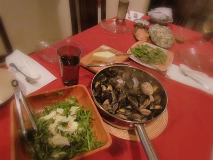 手前から ルッコラのサラダ ムール貝&アサリの白ワインバター蒸し