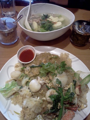 Dさんはチキンベースの卵豆腐が入ったスープ麺 僕は手前の春雨みたいな麺の炒めたもの