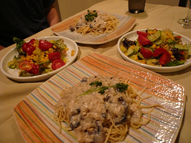 (缶入り)サーモンを使って クリームソースを作ってパスタ それに ゴムなし野菜サラダになりました