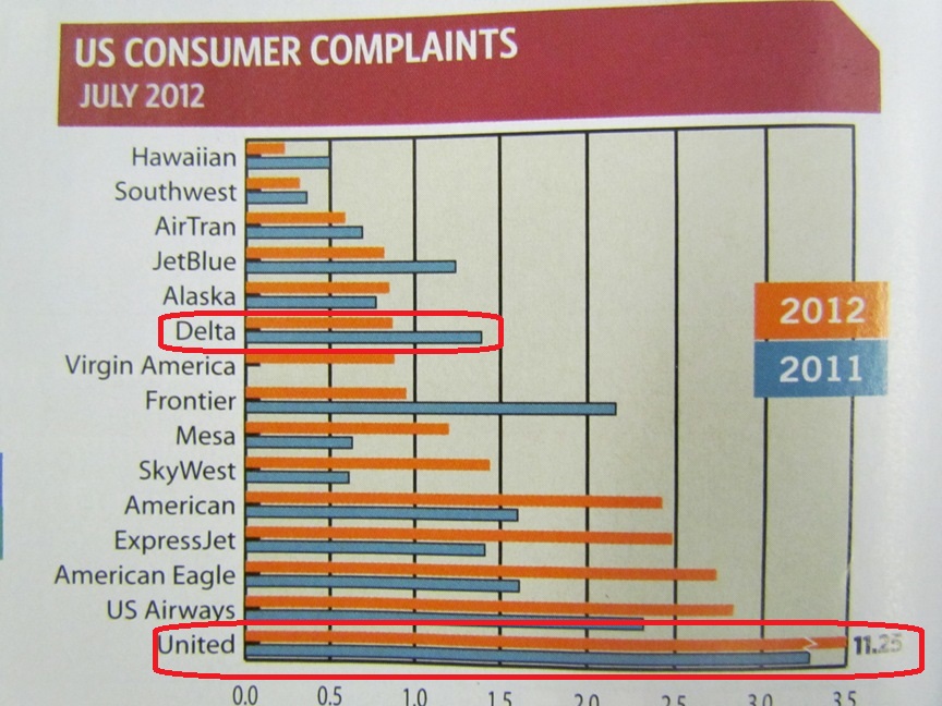 その中でアメリカの消費者の不平不満の数を会社ごとグラフになっていました 面白いのがデルタエアラインが2011年に比べるとクレームが減っているのに対して