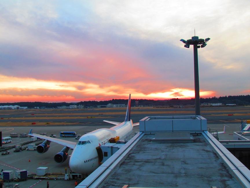 成田空港は真っ赤な夕日に覆われ大変物悲しい雰囲気 Dさんと知り合ってから基本的に旅行は2人でするようになりましたので