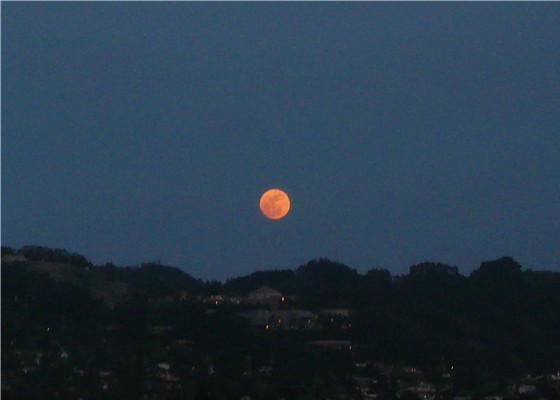 これ、この間の月曜日の晩ですよね? だとしたら、僕も見ていました、このお月さま。モントレーへプチ旅行に出掛けた帰り道、車の中で、地平線から上ってくるオレンジ色の月を発見し、ケヴィンと一緒に盛り上がっていました。きれいでしたよね。天高く昇った時には、カスタード・クリーム色に変化していました。
