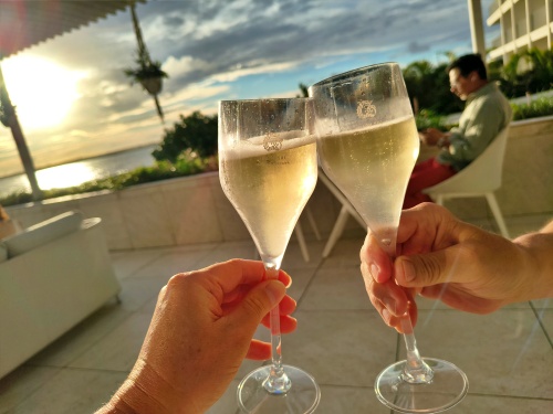 Dさんはそのまま昼寝、僕は写真の整理やブログ執筆をしてのんびり。せっかくのいいホテルですから、こういう時間の過ごし方も贅沢ですよね。気づけば夕方、そろそろ5時。ホテルでのシャンパン無料飲み放題「Happy Hour」の時間です。この日も結婚式のゲストが大勢訪れており、特に女性たちは華やかに着飾っていて目を引きました。