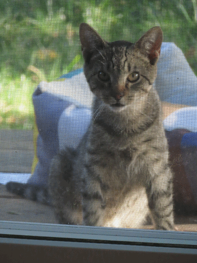 Trader Joe’s で猫用のおもちゃを見つけたので購入し、庭の木にゴム紐で結んでみたところ、とても楽しそうに遊んでくれています。