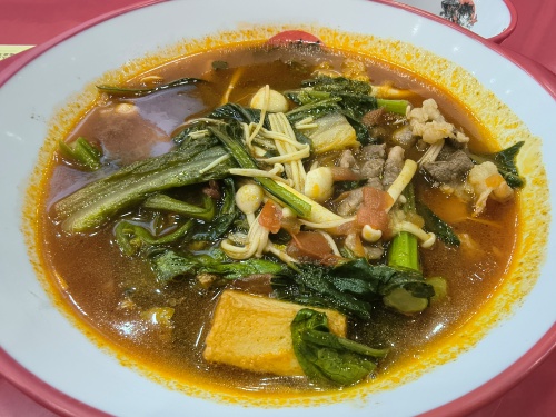 出来上がった丼を受け取り、いざ実食。今回はトマトベースのトムヤム風、酸味と辛さの効いたスープを選びましたが、これがなかなか好みの味。辛さが少し物足りなかったので、辛味スパイスににんにく・ねぎを加えると、ちょうどよい風味に。さらに別皿でゴマだれを用意し、ディップしながら食べるとこれまた美味。満足度高めの一杯でした。ここならDさんを連れて来られるかもしれませんが、やはり食材の少なさが少し気になるところでしょうか。