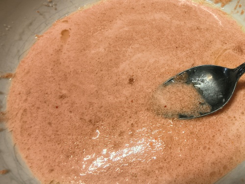 ネットでいくつかレシピを調べ、自分なりに作りやすそうな方法を組み合わせて挑戦しました。明太子の準備 まず明太子を割いて薄皮を取り除き、中身だけにします。この明太子を使ってのソース作り。まず 湯煎で溶かしたバターに明太子を加えて混ぜ、そこに隠し味の白だしを投入しました。すると、ここでバターと白だしが分離します。