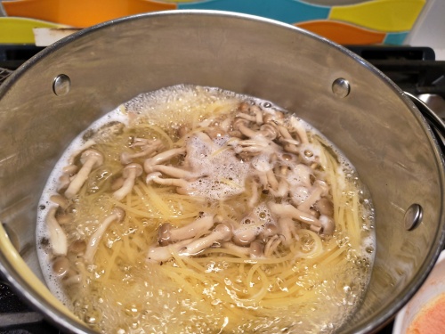 その間に、家にあったしめじと一緒にパスタを茹で上げます。最初はパスタだけを考えていましたが、違う食感のシメジと明太子とパスタはかなり相性がいいので投入決定しました。アルデンテに仕上がった麺としめたっぷりの具材を、洗い物を減らすためにお皿で直接作ってに用意しておいたソースに絡め、ゆで汁で濃度を調整。