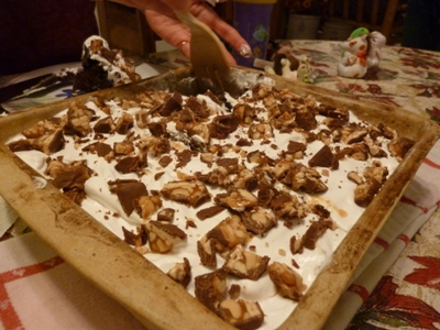 チョコレートケーキにホイップクリーム それにスニッカーズ散らしてありまして