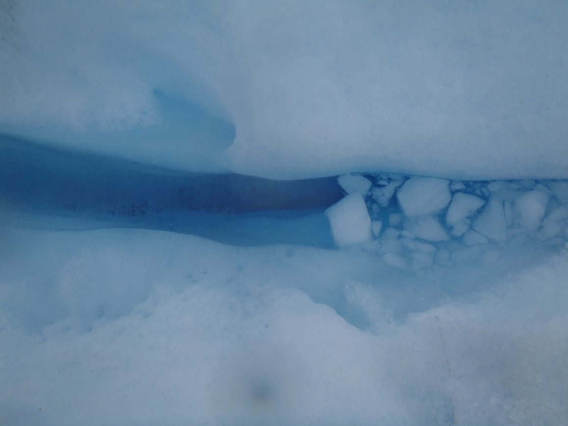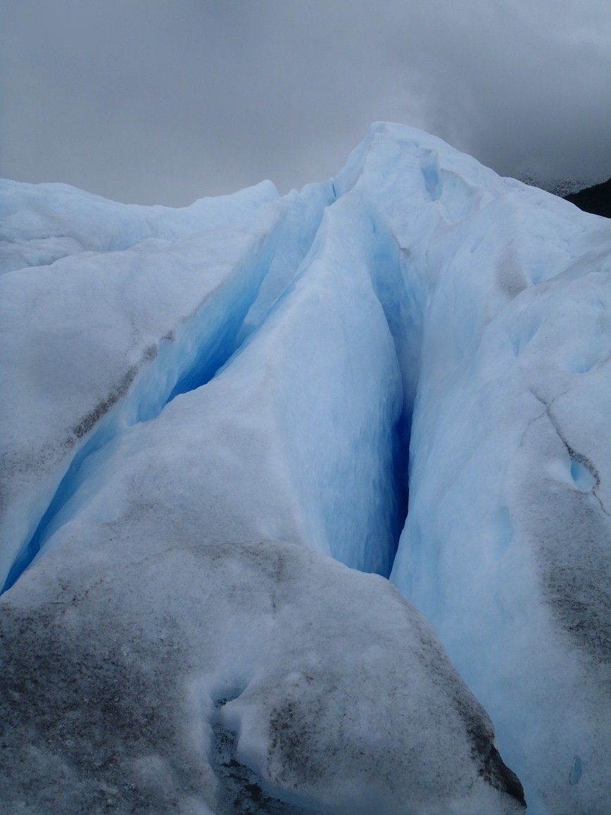 ハイキングの途中 氷河の裂け目 クレバスがところどころあり 深い水色の水がみえます