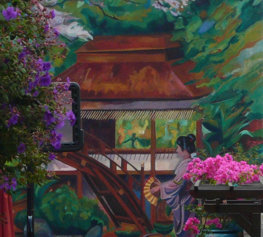 桜の花が咲いているようで わらぶき屋根の家が描かれていて よく見ると着物を着た女性まで・・・