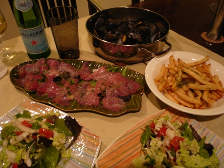 マグロのカルパッチョ ムール貝の白ワイン蒸し 野菜サラダにフレンチフライです