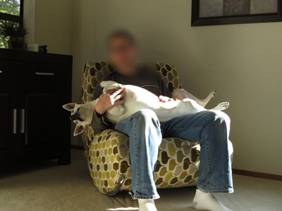 陽だまりの中 DさんがCocoを抱いてロッキングチェアに座っていたのです