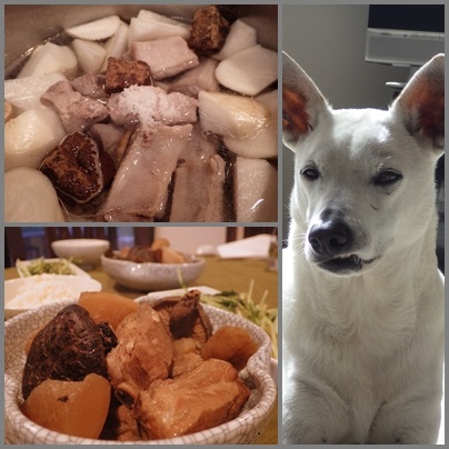 さて夕飯の方は 日本食材店で買ってきたスペア―リブを角煮風に煮込んでみました