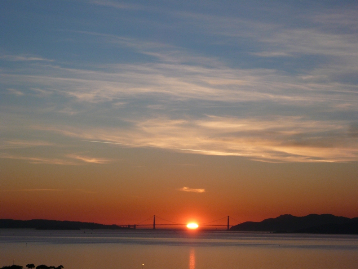 ゴールデンゲイトブリッジのほぼ中央あたりを オレンジ色の夕日が沈んでいきました~