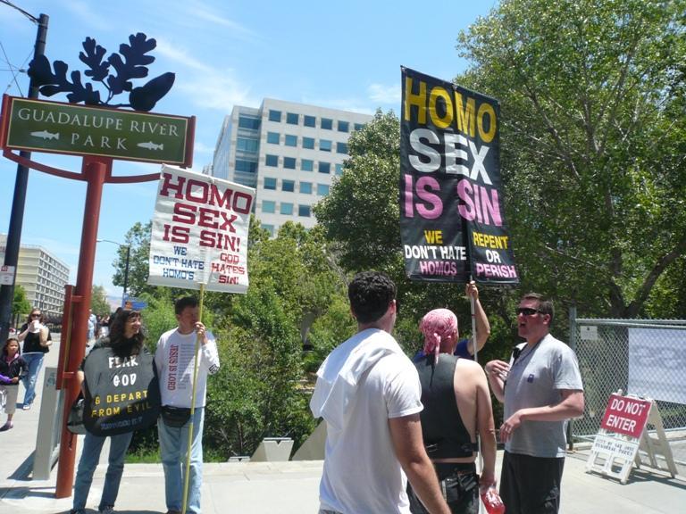 こんなプラカードを掲げている人たちがいました・・・ HOMO SEX IS SINだそうです・・・