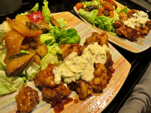 唐揚げを作っている間にタルタルソースを作ります。茹で卵、ネギ、パセリ、キュウリのピクルスを刻んでに低脂肪ヨーグルトとマヨネーズ、マスタードを少々に塩コショウをふりかけてしっかりと混ぜれば自家製低脂肪タルタルソースは出来上がります。からりと揚がった鶏の唐揚げに甘酢を絡めて、タルタルソースをかけ、レタス菜に焼き野菜を添えてやっつけ夕飯の完了です!