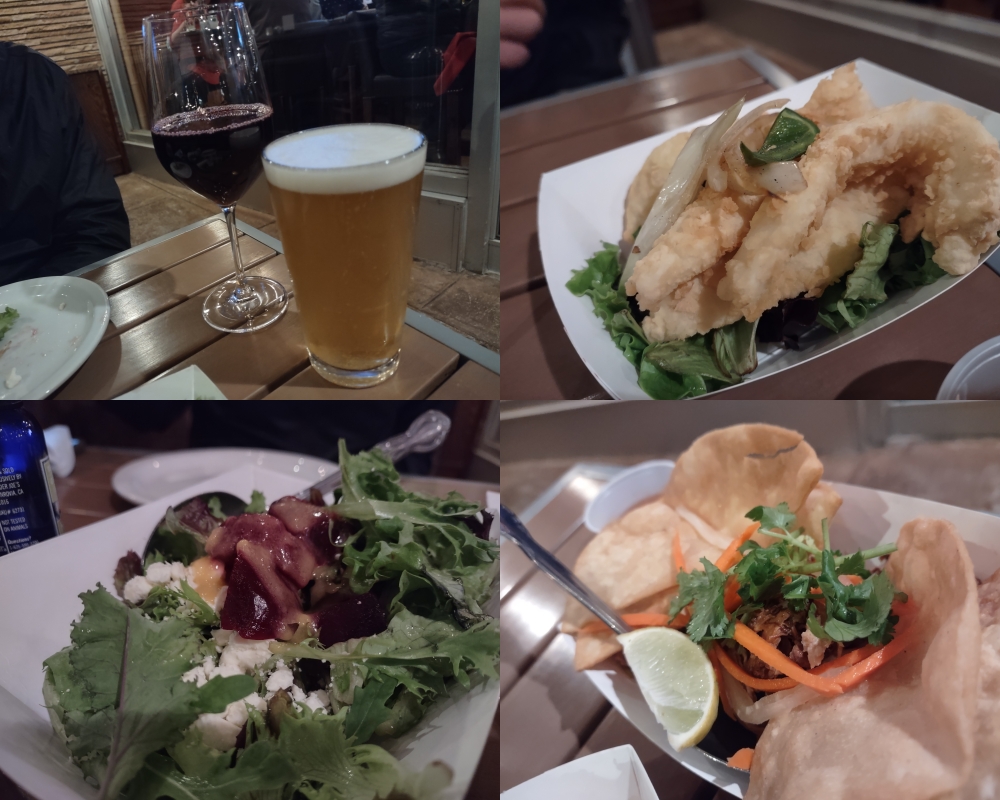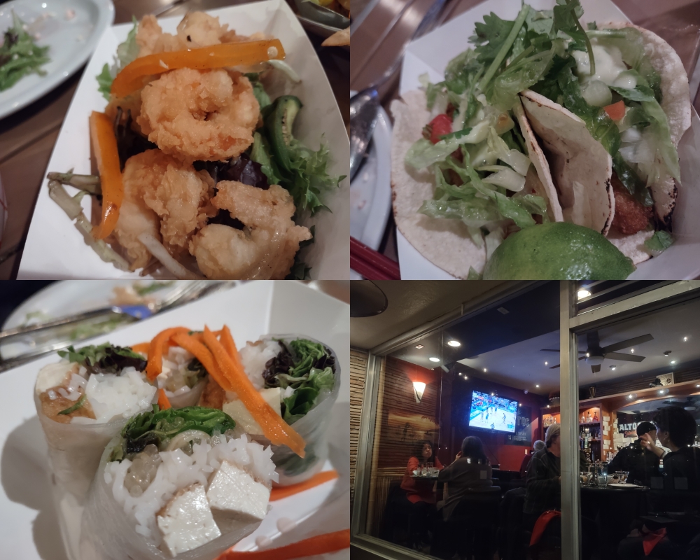 基本的にはこれらのおつまみが夕飯ですので、しっかり食べさせてもらいました。お次は時計回りに、左上からエビフライ、フィッシュタコス、豆腐の生春巻きという感じでした。Dさんはこのベトナム風のピリ辛なエビのフライをすごく気に入ったので2皿目もオーダーしました。僕たちは、外の空気にあたるのが好きなので外で食べましたが、寒い日だったので室内は満席でした。