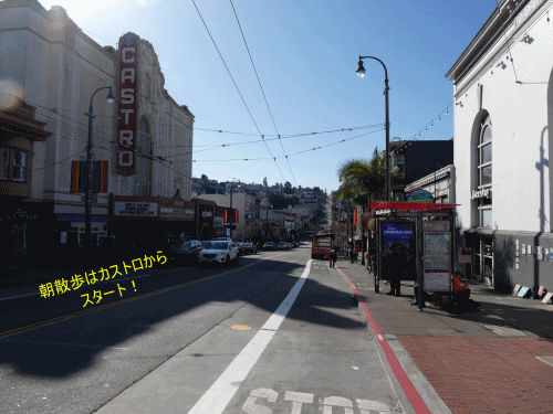 それならばマンネリ化を打破するために、いつもと違う朝散歩をしていつもと違うお店でランチをしようということにしました。そしてやって来たのは男性の好きな男性が集まる街のカストロです。すがすがしい新しい朝は地元の皆さん道のお掃除から始め、前の日の週末の夜の大騒ぎがあったような余韻の残るものをきれいさっぱり拭い去っています。きれいになる街並みを見るのはいいですね。