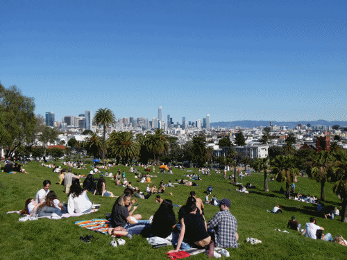ワインでほろ酔いになり、お腹いっぱいのんびりとイタ飯を食べた後はサンフランシスコのゲイビーチと呼ばれる?ドローレスパークの方に足を延ばしてみました。久しぶりの良い天気ということでお昼頃にはもうたくさんの人がこの公園にやってきて、ピクニックセットを持ってきて(一応アルコール禁止ですが)ワインやビールにおつまみを広げて、楽し気に寛いていました。