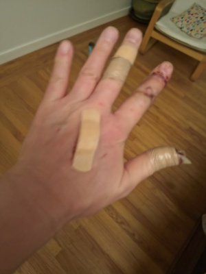 これは落ち着かせる薬も必要だと思い、以前睡眠誘発剤として処方されていた薬(もともとは鎮静剤)を服用しました。鮮血と穴の開いた指の光景が目に焼き付いていて、それほど異常な精神状態だったのだと思います。一方、捕らえられたSpottyの方は、ケージの中で観念したようにおとなしくしていました。これほどの流血は大人になって初めてです。指の根元を縛って血流を抑え、抗菌剤をたっぷりと塗り、防水効果のある人工皮膚のような絆創膏をぴったりと貼って、ようやく止血に成功しました。ホッとした途端、今度は激しい痛みが襲ってきます。急いで鎮痛剤を飲みました。これほどの大怪我は初めてだったので、自分でもわかるほど精神的にハイな興奮状態になっていました。
