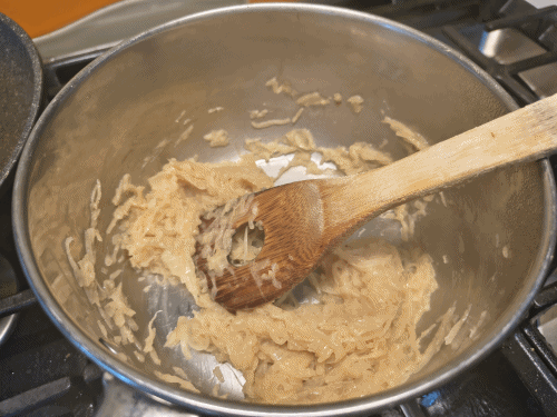 もし自分で作れたらかなり安上がりになるな、という下心もあって挑戦してみました。作り方は、薄切りにした玉ねぎをバターとオイルでひたすら飴色になるまで炒めるだけ!途中で焦げてきたら少し水を足し、旨味を溶かしながら炒める作業を繰り返します。