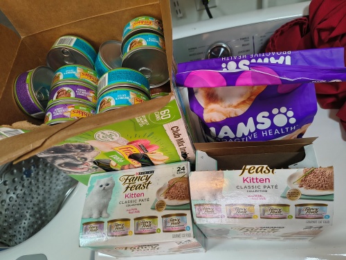 さて猫さんたちですが、こちらにコメントをくださるDavidさんが、我が家の野良猫たちのためにご飯をドネーションしてくださいました!カリカリのドライフードから缶詰まで、こんなにたくさん。