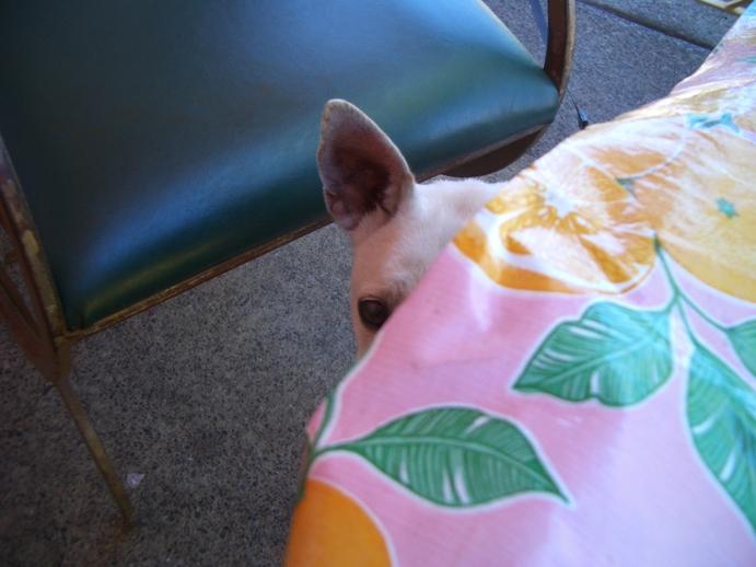 テーブルクロスの端からのぞくCocoの何かを訴えかけるような目、笑ってしまいました。(ごめんね、Coco。あなたは真剣なのよね。)
