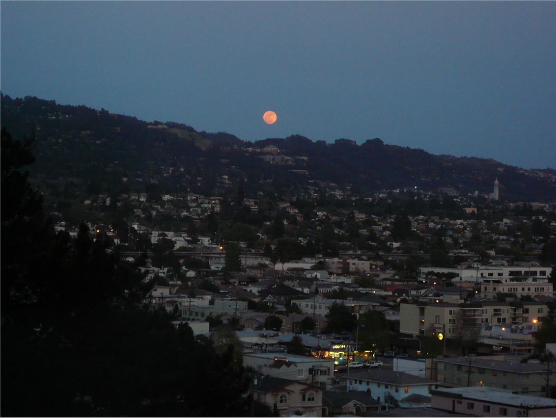 これ、この間の月曜日の晩ですよね? だとしたら、僕も見ていました、このお月さま。モントレーへプチ旅行に出掛けた帰り道、車の中で、地平線から上ってくるオレンジ色の月を発見し、ケヴィンと一緒に盛り上がっていました。きれいでしたよね。天高く昇った時には、カスタード・クリーム色に変化していました。