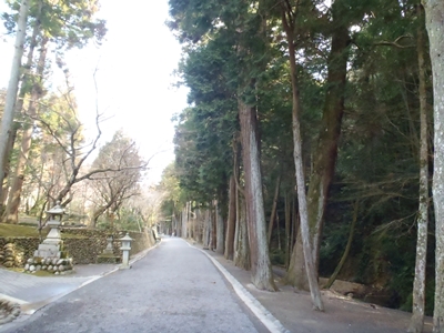 小川が流れて 杉の木が立ち並ぶ境内の参道を歩くと