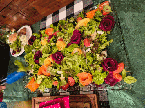 ところが今年は、きれいなお花を形どった大きなサラダプレートが登場して、少し驚きました。誰が持ってきたんだろうと思って聞いてみたら、ホストファミリーのご近所さんが今年初めて参加されたそうで、彼女の家の菜園で採れた野菜を使ったサラダとのこと。